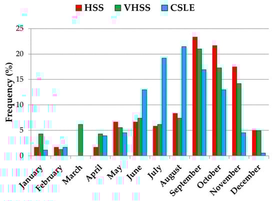 Monthly frequency histograms of HSS, VHSS and CSLE.