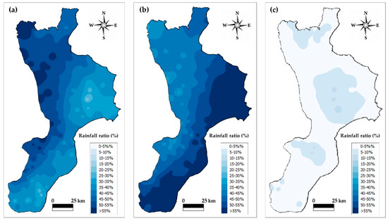 Ratio between cluster rainfall and total rainfall of all events for HSS (a), VHSS (b) and CSLE (c).