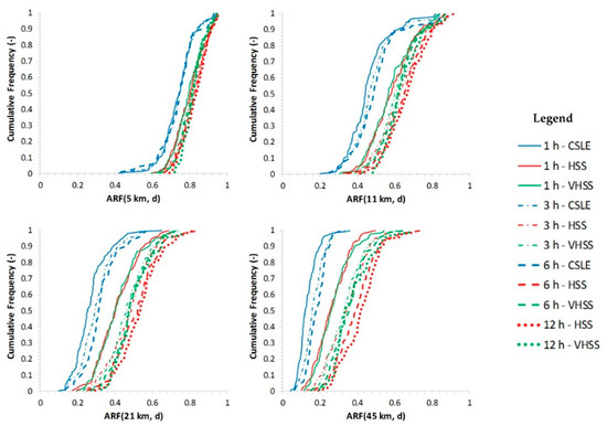 Then, for each investigated group, the authors analyzed the cumulative frequency distributions for Areal Reduction Factor (ARF, Equation (1)).