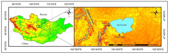Global climate change has apparent impacts on the environmental and hydrological systems [1]. It is possible to determine the impacts by temporal variability in the surface water resources at the center of the mainland [2] especially over the semi-arid steppe, Gobi, and desert region of Central Asia [3]. Thus, it has become an interesting issue to study the change of water resources in those regions since there is low total annual precipitation and few surface water distributions [4,5]. Those regions include Mongolia, where the annual average air temperature has increased by 2.2 °C since the 1940s, which is three times over-heated than global warming speed. The territory of Mongolia is characterized as semi-arid to arid. Total annual precipitation is 300–400 mm in the Northern mountainous regions of Mongolia; 150–250 mm in the steppe; 100–150 mm in the steppe desert; and 50–100 mm in the Gobi Desert. About 80% to 90% of total annual precipitation falls in the warm season, which is from April to September [6]. Thus, the Gobi, desert, and steppe regions of Mongolia are considered vulnerable for global climate change [7,8]. Monitoring surface water ecosystems in this region may be necessary for detecting the effects of global climate change. One of these regions is the Ugii Nuur Lake basin, which is a representative location for the dry steppe region of Mongolia and the natural ecosystem influenced by desertification and dryness (Figure 1) [9,10,11]. The Ugii Nuur Lake has been registered under the Ramsar Convention for the Protection of Wetlands of International Importance since 1998; also, it is a famous tourist destination in Mongolia. Meanwhile, the Ugii Nuur Lake basin is an ideal location to study Holocene climate evolution in the continental area of the steppe region in Mongolia [12,13].