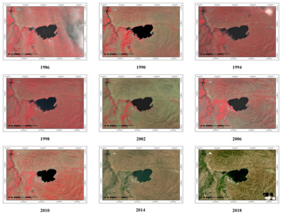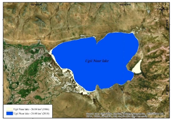 For showing a decline in time series of the water surface areas of the Ugii Nuur Lake calculated by the NDWI index from Landsat satellite, the imagery of the lake for every four years from 1986 to 2018 is shown in Figure 5. The shape and surface area of the lake have considerably changed over the last 30 years.