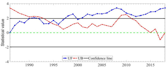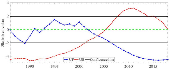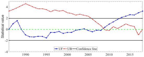 Finally, and were drawn as and curves. Where = 0 and is a standard normal distribution. There is an upward trend when it is 0, while there is a downward trend when it is less than 0. If a significant level α is given, according to the normal distribution table we get the critical value t0 and, if > t0, this indicates that there is an obvious change trend in the sequence. If the result is multiplied by −1, then we get the reverse sequence’s statistic, where = 0. If there is an intersection between the two curves, the intersection is the beginning of the mutation [34]. When the two curves, and intersect and the intersection point is between the confidence lines, then the intersection point is the abrupt point. According to the test, if between the confidence lines that were defined from the processing of the data the value “zero” is included, then these values present mean values that are statistically equal. Thus, confidence lines are significant levels [35].