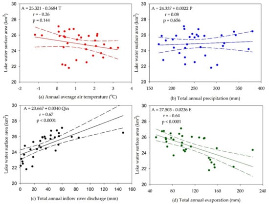 Linear regression for a relationship between the water surface area of the lake and variables such as (a) air temperature, (b) precipitation, (c) river flow, and (d) evaporation.