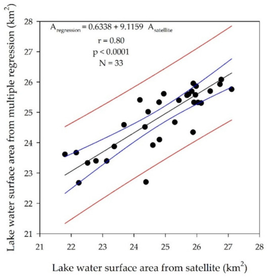 A relationship between lake surface areas estimated from satellite and multiple regression equation.