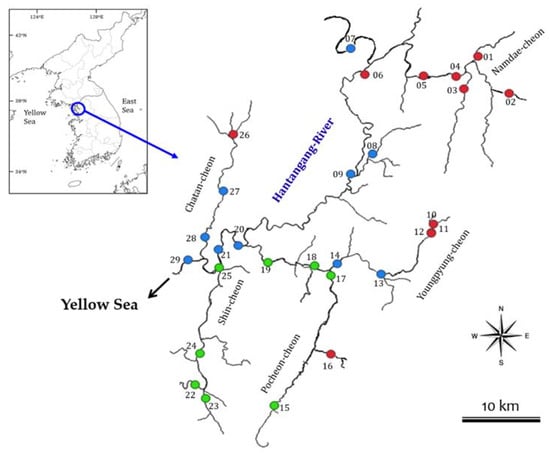 To collect epilithic diatoms and river water samples, a total of 29 sites was selected within the mainstream and tributaries of the Hantangang River (Figure 1). Since 2007, the study sites have been continuously monitored for aquatic communities and water quality with land-use under the project of NIER (National Institute of Environmental Research, Korea). Sampling campaigns were conducted twice a year; in May (pre-monsoon) and September (post-monsoon), between 2012 and 2015.