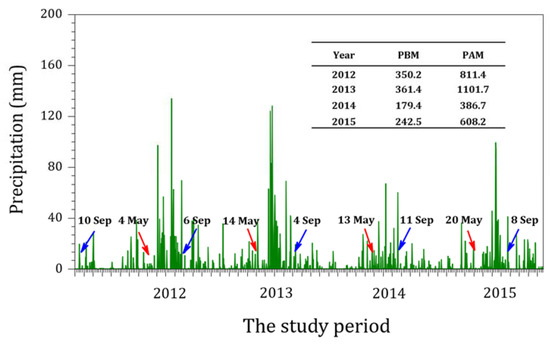 Daily precipitation in the Hantangang River basin between 2012 and 2015, measured by a Korea Weather Center (http://www.kma.go.kr/index.jsp). The arrows are the sampling dates before (red) and after the monsoon (blue), respectively. A small table in the figure showed the total precipitation for the periods of before (PBM) and after monsoon (PAM); In 2012, PBM or the former indicate the sum of daily precipitation from 10 September to 3 May, while PAM or the latter are those from 4 May to 6 September of 2012, respectively.
