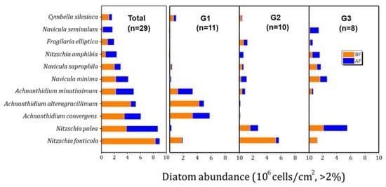 The community characteristics of the epilithic diatoms in this study are shown in Table 1 and Table 2 and Figure 4 and Figure 5. Abundance showed no difference between the groups, whereas the diversity, richness, and number of species were higher in G2. The dominant species in each group were Table 2: in G1, Achnanthidium alteragracillimum (26.7%–6.1%) in the pre-monsoon periods, and Achnanthidium minutissimum (27.3%–29.8%) dominated in the post-monsoon periods; in G2 and G3, Nitzschia fonticola (26.0%–43.2%) dominated in the pre-monsoon periods, and Nitzschia palea (14.0%–45.2%) in the post-monsoon periods. Both species showed similar trends in two groups.