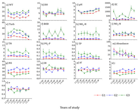 All water quality parameters (conductivity, turbidity, BOD, NH3-N, NO3-N, TN, PO4-P, and TP) showed higher concentrations in G3, which comprises the tributaries and the downstream region of the main river. Lower values were observed in G1 and G2, which comprises the upper and middle reaches of the main river. This pattern infers a complex downstream gradient [44], which may be caused by a number of factors, such as nutrient concentrations, soil usage, and flow velocity.