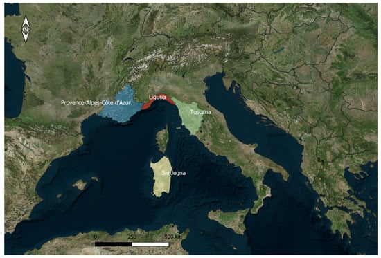 Starting from such a background, in this contribution we present the results of a survey run by means of interviews and questionnaires in the Mediterranean areas of Italy (three regions) and France (one region) in order to synthesise evidence on the actual behaviour of local authorities towards the uptake of WrGIs/SuDSs and the attitude of relevant stakeholders, involved in their design, maintenance, or uptake, towards their implementation. The area under analysis is in the northwestern Mediterranean and precisely the four regions of Sardegna, Toscana, Liguria (Italy), and Provence-Alpes-Côte d’Azur (PACA, France; Figure 1). The interviews were run in these neighbouring regions, as this research is part of the activities of the TRIG-Eau INTERREG MARITTIMO project.