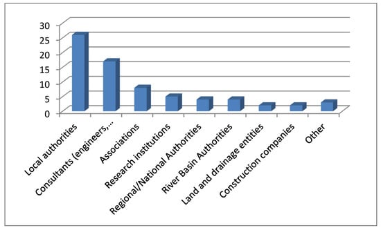 In the first and second section of the questionnaire, we aimed at gathering basic information for characterising the stakeholders. We asked the interviewed person (or the one compiling the questionnaire) to answer questions about the institution/organisation, type of institution/organisation, and his/her role in the institution. We also required qualitative information on the main features of the area (such as urban, peri-urban or rural; inland or coastal; population size, etc.) in which the institution/organisation was running its main activities. We grouped the questions posed to the stakeholders according to: (i) actual behaviour on WrGI/SuDS implementation (15 questions), (ii) attitude towards WrGIs/SuDSs (eight questions). We formulated questions to assess the actual behaviour, documenting the types of WrGIs/SuDSs that were implemented, as well as the reasons or motivations for using them. We then investigated the attitude of all of the stakeholders towards innovative approaches to urban drainage management, including the use for which they believe WrGIs/SuDSs are more functional, and which actions should/could be set in practice to facilitate their diffusion.