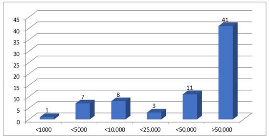 The majority of the stakeholders operate in areas that cover urban, peri-urban and rural areas (37 SHs). In total, the urban area is of interest for 57 out of 71 respondents. The peri-urban area is of exclusive interest for six respondents, while the rural area for five only. The majority of the stakeholders interviewed (41 SHs) acts in areas with more than 50,000 inhabitants. A population above 50,000 inhabitants is indicated with particular frequency by the interviewees from the PACA region (France, 20 SHs out of 22). Eleven SHs act in areas with populations between 50,000 and 25,000 and three in areas with a population between 25,000 and 10,000. The smaller population centres are represented by eight SHs, acting in areas with populations between 10,000 and 5000 inhabitants, seven in areas with populations between 5000 and 1000 inhabitants, and there is only one case of a municipality with fewer than 1000 inhabitants (Figure 3).
