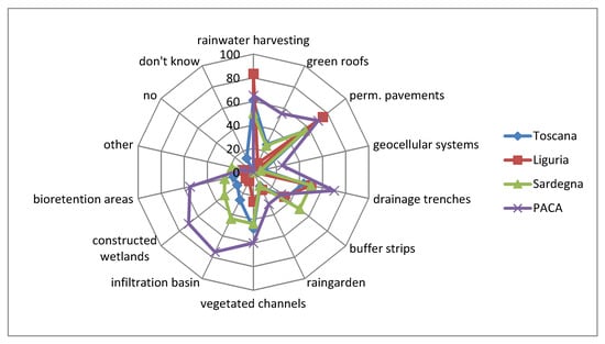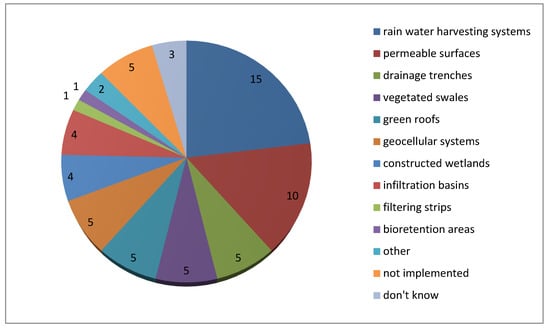 With regard to WrGIs/SuDSs, 18 out of 26 administrations confirmed that they are in place in their area. We found the absence of any type of SuDS in five local administrations, while in three cases the respondents were unable to provide an answer to this regard. This is somehow surprising when looking at the initial question on familiarity with WrGIs/SuDSs, where only 13 out 26 local administrations replied positively. We explain this as a result of a terminology gap in local authorities in classifying these infrastructures. This has already been highlighted in [49] and may be viewed as an example of miscommunication. In fact, familiarity with WrGIs/SuDSs is probably lower because the interviewed staff did not know the infrastructures with such definitions/terms. This in turn may be due to the fact that interest in these infrastructures is relatively new, and still not widespread in university/professional courses in the regions. Hence, staffs at local authorities, advanced in age, having also less demand and obligation for continuous learning, are not updated on the unifying background, that is recently given under the name of WrGIs/SuDSs, to infrastructures such rainwater harvesting, permeable pavements, and green roofs, that have been on the scene for decades.