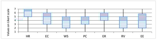Stakeholders were asked for which services, in their opinion, WrGIs/SuDSs were the most suitable. We proposed seven predefined voices: (1) urban and peri-urban flood risk control (HR), (2) protection against erosion (EC), (3) increase in water resource (WS), (4) pollution control (PC), (5) environmental restoration (ER), (6) recreational service (RV), and (7) economic efficiency (EE). The interviewees expressed their opinion, assigning to each service a value on a scale between 1 (the least important element) and 7 (most important). The results (Figure 7) show that the WrGIs/SuDSs are generally considered relevant for providing HR services, which obtained the highest median (6.5) and a 25th percentile of 5. Half of the interviewees assigned to HR values between 5 and 7. The second theme for reliability is ER, with a median of 5, a 25th percentile of 4, and a 75th of 6. EC obtained similar values, but was characterised by less homogeneity, with a 25th percentile of 3. WS, PC, RV, and EE obtained equal medians, but different distributions. In particular, WS and RV are the services to which lower values were assigned, 50% of the time between 2 and 5.