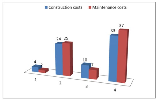 With respect to the cost of the construction and maintenance of WrGIs/SuDSs compared to conventional infrastructures, in more than 50% of the cases, stakeholders say they have no information for answering these questions (Figure 8). However, although the costs for both WrGI/SuDS construction and maintenance are higher, in about 35% of the cases, the SHs believe the benefits overwhelm the cost increase. A small number of stakeholders consider the costs of WrGI/SuDS construction and maintenance to be even less expensive (ten and seven, respectively). The opinion of the subjects who considered the construction and maintenance costs to be higher than those of the grey infrastructures is probably influenced by their lack of familiarity with these interventions, which have not yet been carried out systematically. To support the cost–benefits evaluation of these infrastructures, decision support systems exist that allow for the comparison of different drainage scenarios, conventional or with the use of WrGIs/SuDSs, on construction and maintenance costs, energy consumption, greenhouse gas emissions, and the provision of ecosystem services (i.e., E2STORMED; [52]).