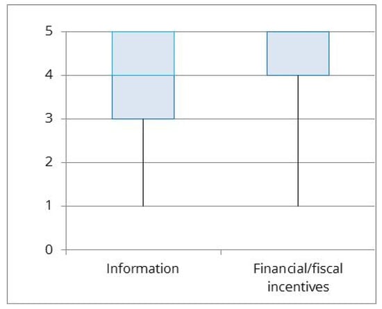 Finally, respondents indicated that the dissemination of information can be an effective tool to increase interest in these systems, as well as fiscal and financial incentives (Figure 10). All the stakeholders agreed that information activities and campaigns may support the uptake of new green measures for stormwater runoff management. However, they believed that financial and fiscal incentives might be more relevant for stimulating the adoption of GIs.