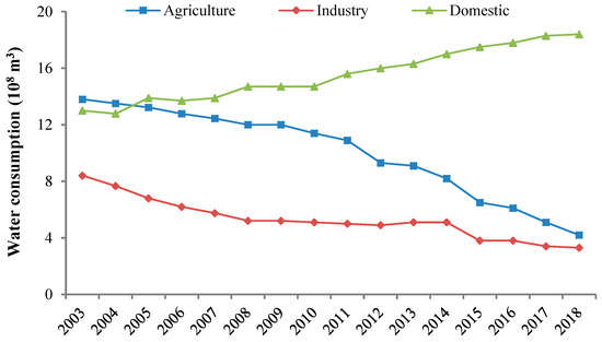 Simultaneously, Beijing’s water use structure has changed tremendously. Due to urbanization, industrial structure upgrading, and other reasons, agricultural and industrial water consumption has continued to decrease over the past few decades, while domestic water consumption has continued to increase (Figure 1). Since 2005, the domestic water consumption has surpassed agricultural water consumption, constituting the largest usage of water in Beijing, indicating that domestic water use may become the leading crisis factor for Beijing’s future water supply. Over the years, the increase in domestic water consumption was partly due to the increase in population, which jumped from 14.56 million in 2003 to 21.73 million (the peak) in 2016; on the other hand, due to the economic improvements, the lifestyles of Beijing’s residents tend to be more water intensive, with domestic water consumption per capita increasing from 193 L/day in 2013 to 231 L/day in 2017, approximately a 20% increase in five years [32]. In recent years, Beijing’s population has been effectively controlled, while the domestic water consumption per capita has continued to increase. Therefore, water-saving efforts at the individual level will become the key to the Beijing’s domestic water demand management.