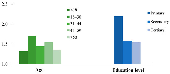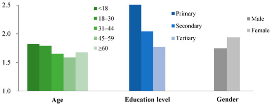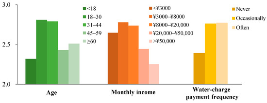 The individual attributes included gender, age, education level, income, and water-charge payment frequency as surveyed in the questionnaire. External stimuli included water price stimulus, water use information stimulus, and water-saving publicity and education stimulus. According to the content of water-saving publicity and education, water-saving publicity and education stimulus are divided into two categories: teach knowledge (e.g., the current situation of water resources and water policy) and teach water-saving methods and skills. The analysis results are presented in Figure 2, Figure 3, Figure 4 and Figure 5.