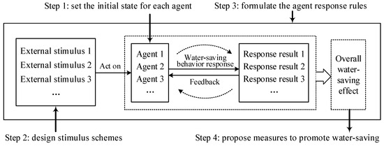The specific steps of modeling and analysis are summarized as follows: (1) build a system comprising several individuals (i.e., agents) on the basis of the basic situation of the research area and set the initial state for each agent in the system; (2) design stimulus schemes and set different regulatory scenarios for each external stimulus; (3) according to the sensitivity of agents with different attributes to various external stimuli, formulate the agent response rules corresponding to various attribute states of the agent under different stimulus schemes. This is so that agents in an initial state can generate a corresponding water-saving response according to response rules under different external stimulus schemes, and the response results (e.g., the change in water consumption or water charges) as feedback information further affect the subsequent water-saving response of agents. This is to simulate the dynamic process of individual water use changes with time under different external stimulus schemes and reflect the dynamic change of water use and the overall water-saving effect of the whole system simultaneously; and (4) based on the regulation of external stimulus, compare and analyze the water-saving effects of various stimulus schemes, summarize the stimulus schemes with better water-saving effects, and propose measures to promote individuals’ water-saving behavior. The framework of model construction and analysis is presented in Figure 6.