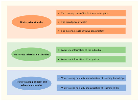 The external stimuli in this model comprised a water price stimulus, water use information stimulus, and water-saving publicity and education stimulus. Each external stimulus has multiple regulatory scenarios. Figure 7 presents the content considered in the stimulus schemes.