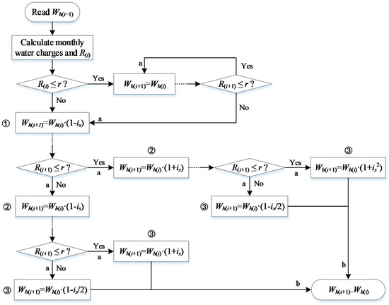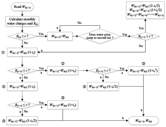 The specific agent response rule is as follows: household water consumption in the current month (Wh(i)) is charged according to the tiered water price. If the ratio R of the monthly water charges to the income in the current month (R(i)) is greater than a certain ratio r, the household water consumption in the next month (Wh(i+1)) is reduced by different agents with varying degrees of is, and the household water consumption in the month after the next month (Wh(i+2)) is adjusted according to water charges in the next month. Considering that the impact of water price stimulus on individuals’ water use behavior weakens over time, we assumed that the aforementioned adjustment would not be more than three times (i.e., a duration of three months) and that water would be used according to the last adjusted water use mode. The specific water-saving response process is presented in Figure 8.
