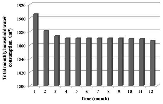 Based on the population structure of Beijing and the sensitivity of individuals with different attributes to the water price stimulus, the influence of water price factors on individual water use under the current water price system in Beijing was quantitatively studied by constructing a model. Assuming that all agents in the system do not know the monthly water charges, the agents use water normally according to the original water use habits in the initial month. The model calculation results demonstrated the change in the total monthly domestic water consumption of the system under the current water price system in Beijing (Figure 10).