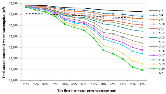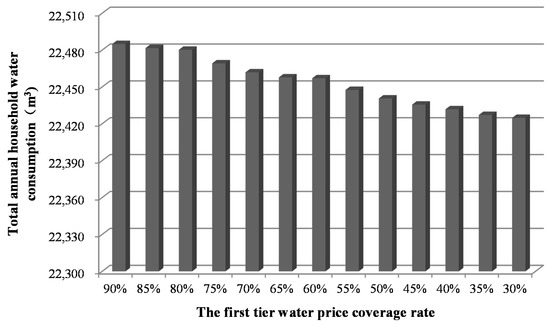 At present, the coverage rate of the first-tier water price in Beijing is 90%, indicating that 90% of the residents’ household water charges are not affected by the implementation of the tiered water price. Some scholars have suggested that the coverage rate of the first-tier water price should be reduced to 30% [39] to ensure that most residents are constrained by the tiered water price and to promote more residents to save water. In this part, the first-tier water price coverage rate is reduced from 90% to 30%. The change in water consumption under different first-tier water price coverage rates is presented in Figure 11.