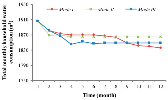 Change in the total monthly household water consumption in the three cases.