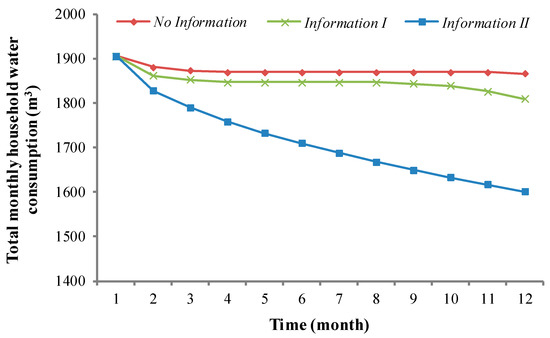 Based on this analysis, we then quantitatively compared the implementation of two types of water use information stimulus (Information I, Information II) with the absence of the water use information stimulus (No Information) through model simulation. The change in the total monthly household water consumption in three cases is presented in Figure 14. In Figure 14, the implementation of the water use information stimulus can promote individual water saving. Compared with No Information, the implementation of Information I can reduce the total household water consumption by approximately 1.4% over the whole year. The implementation of Information II has a more obvious effect on promoting individuals’ water-saving behavior, reducing the total annual household water consumption by approximately 8.5%. This finding occurs because Information I mainly affects the agents with large water consumption and with little attention to water use information originally, whereas Information II can affect all the agents with water consumption that exceeds the average water consumption of the system, which results in the average water consumption of the system decreasing with the change in the agent’s water-saving behavior. Therefore, the implementation of Information II can form a virtuous circle of interaction between the agent’s water-saving behavior and the system’s water-saving level to improve the system’s water-saving level to a greater extent and finally stabilize the whole system in the state of a high water-saving level.