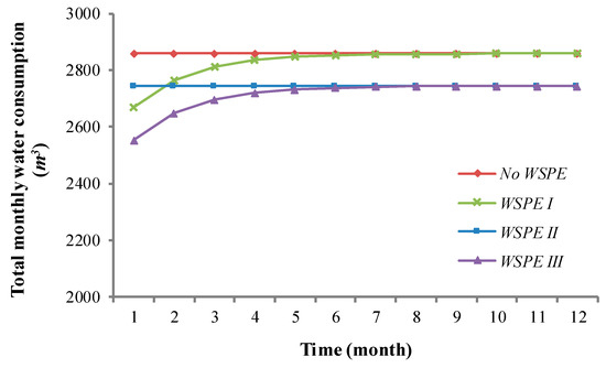 Change in the total monthly water consumption in four cases.