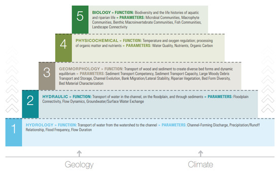 Stream Functions Pyramid Framework, depicting function category statements and function parameters for all five 5 levels of the Pyramid [31]. Reproduced with permissions from Harman et al., A Function-Based Framework for Stream Assessment and Restoration Projects, US Environmental Protection Agency, Office of Wetlands, Oceans, and Watersheds, Washington, DC, EPA 843-K-12-006, 2012.