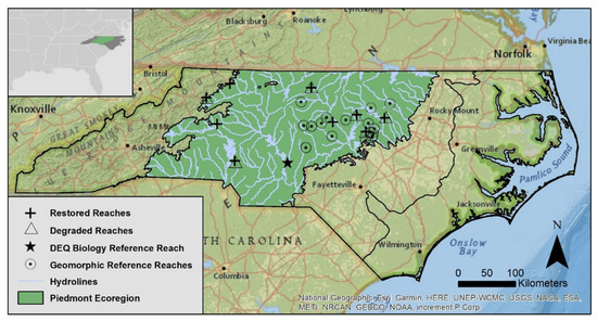 Research on methods to implement and evaluate the functional uplift resulting from restoration actions is a relatively new path of study [2] that involves identifying functions that support desired ecosystem services and how best to recover those lost functions [20]. Recent studies have evaluated the tools for gauging ecological change resulting from restoration efforts [21,22,23]. Other studies have focused on evaluating the response of macroinvertebrates and fish communities to restoration efforts [24,25,26]. In an assessment of 79 stream reaches across North Carolina (NC), Doll et al. [24] showed that EPT taxa (Ephemeroptera, Plecoptera, and Trichoptera) were positively correlated with accessible floodplain width (i.e., entrenchment ratio), substrate size, and mean bankfull depth, and negatively correlated with width-to-depth ratio and sinuosity. Results indicated that deliberate site selection, restoration activities, and design can optimize biotic condition and ecological function. Further, results indicated that larger streams with steeper valleys, larger substrate, and undeveloped watersheds were expected to have higher numbers of EPT taxa [24]. At 28 predominantly agricultural watershed sites in Ohio, D’Ambrosio et al. [25] also found that macroinvertebrate communities were driven by floodplain connection, as well as stream slope and size. In a study of 31 wadeable Piedmont Georgia streams, Walters et al. [17] found that macroinvertebrate metrics were best predicted by urban cover, specific conductivity, fines in riffles, and local relief.