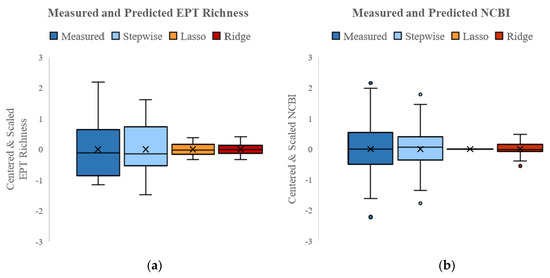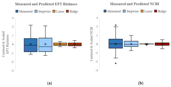 Measured and predicted centered and scaled values for (a) EPT richness and (b) the NCBI for the reduced SQT+ stepwise dataset (n = 34). The “x” indicates the mean value.