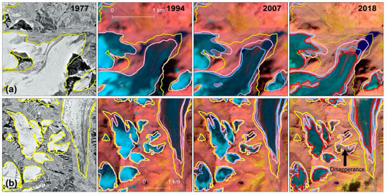 - Narama, C.; Kaab, A.; Duishonakunov, M.; Abdrakhmatov, K. Spatial variability of recent glacier area changes in the Tien Shan Mountains, Central Asia, using Corona (similar to 1970), Landsat (similar to 2000), and ALOS (similar to 2007) satellite data. Glob. Planet. Chang. 2010, 71, 42–54. [Google Scholar] [CrossRef]