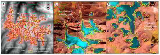 - Paul, F.; Barrand, N.E.; Baumann, S.; Berthier, E.; Bolch, T.; Casey, K.; Frey, H.; Joshi, S.P.; Konovalov, V.; Le Bris, R.; et al. On the accuracy of glacier outlines derived from remote-sensing data. Ann. Glaciol. 2013, 54, 171–183. [Google Scholar] [CrossRef]