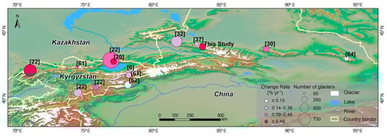 | Location | Investigated Period | Number/Total Area (km2) of Glaciers | Change Rate (% year−1) | Reference |