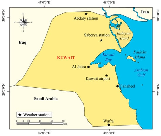 In this study, the KIA weather station was selected for the necessary meteorological data collection. Due to the continuity of its data records, the station is considered the most suitable station for comprehensive meteorological analyses in the state [24]. The KIA station is a synoptic weather station located at 29.22° N, 47.97° E. Daily precipitation, maximum and minimum temperatures, maximum and minimum relative humidity, average wind speeds, and pan evaporation data are available from January 1993 to July 2015. Wind speeds and air temperatures were collected at a height of 2 m. The average relative humidity can be calculated by taking the arithmetic mean of the maximum and minimum daily measurements. Table 1 summarizes the basic descriptive statistics for the daily meteorological data collected at the station, and the location of the KIA station is illustrated in Figure 1. In addition, pan evaporation and air temperature data are available from the Abdaly and Saberya weather stations, respectively. These datasets will be used to test model generalizability at a later stage to assess the model’s robustness.