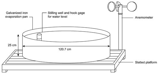 Pan evaporation data were collected using a standard US weather bureau class A pan (Figure 2). The pan is 120.7 cm in width by 25 cm in depth. Just like other pans, the side wall of the pan is exposed to the open atmosphere, which substantially affects the energy balance governing the water inside the pan. Thus, collected pan evaporation data are usually greater than lake evaporation data. Therefore, it is customary to convert pan evaporation measurements to the corresponding lake evaporation equivalent by multiplying the measured pan evaporation data by the pan coefficient. The pan coefficient represents the ratio of lake evaporation to pan evaporation and is always less than one. In the study area of the current study, the measured pan evaporation rates from KIA station have been modeled and verified by several previous studies [25,26,27].