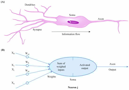 ANNs are sophisticated information processing systems that emulate human intelligence in handling and processing information. They are best known for their capability to model highly nonlinear processes, including pattern recognition problems. The ANNs are basically composed of input, hidden, and output layers that are connected to artificial neurons. These artificial neurons function in a similar way to biological neurons in processing parameters stored in the input layer. Each processed stored parameter is modified via weighting. This weight, frequently referred to as a synaptic weight, functions comparably to a synaptic junction in a biological neuron. Figure 3 provides a schematic representation of information processed by artificial neurons.