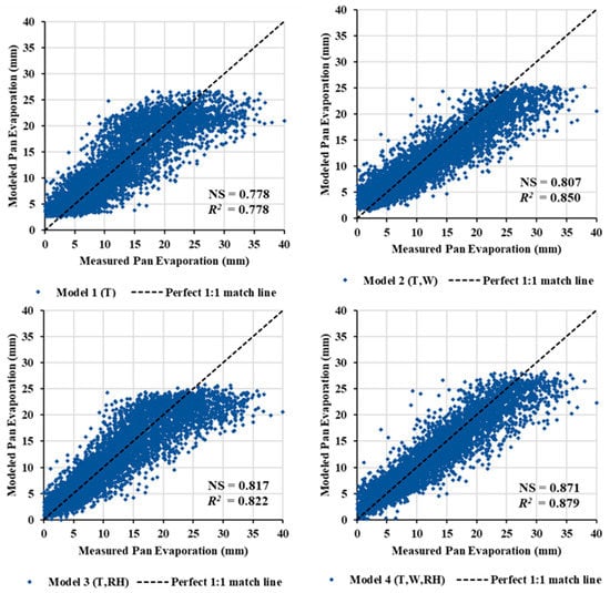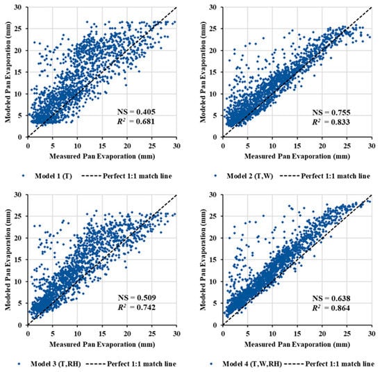 The biases of the ANN models’ performance were much lower during the validation period (Figure 6). Except for model 4, Figure 6 shows a random scattering of results above and below the 1:1 line, thus indicating the appropriate randomness representation in the models’ predictions. This outcome is likely attributable to the less frequent occurrences of higher pan evaporation rates within the validation period. The validation period covered a 20% subset of the entire data range. Consequently, fewer instances of high evaporation rates occurred, which led to reductions in the models’ biases. Model 4, however, presents a different pattern and appears to consistently overestimate pan evaporation rates. The overfitting problem may underlie this outcome.