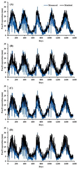 Modeled and measured pan evaporation time series (validation period) for (A) Model 1 (T), (B) Model 2 (T, W), (C) Model 3 (T, RH), and (D) Model 4 (T, W, RH). T: average daily temperature; RH: average relative humidity; W: average wind speed.