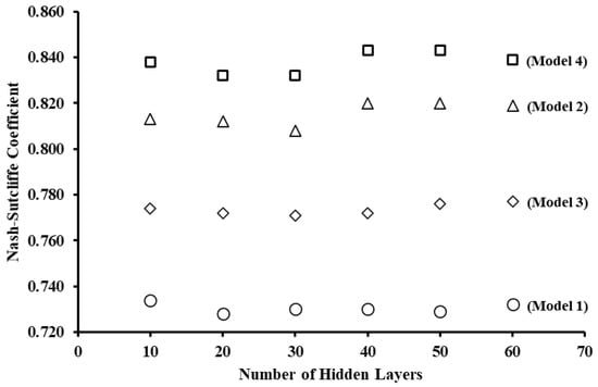 It essential to investigate the effects of ANN architecture on the models’ performance. Sensitivity analysis results regarding the number of hidden layers used to build the ANN models are presented in Figure 8. Each model began with 10 hidden layers, which were then increased by increments of 10 up to 60 hidden layers. Modeled pan evaporation rates were assessed based on the NS coefficient. The NS values presented in Figure 8 were calculated for the entire data range. Variations in the number of hidden layers were found to have a minimal effect on the models’ performance. This finding agrees with that of Bruton et al. [13], who conducted the same sensitivity analysis for daily pan evaporation rates at weather stations located within humid areas. The ANN parameters that were used for constructing the best performing model in the validation period (model 2) are listed in Table 4.