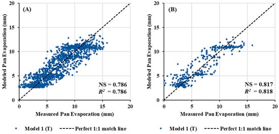 Modeled versus measured pan evaporation data for the Abdaly weather station during the (A) training period; (B) validation period.