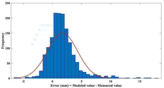 Despite the soundness of ANN-based models’ application, there are minor model drawbacks that should be considered. First, the selection of the number of hidden layers for model construction and sensitivity analysis is quite arbitrary. The optimal number of hidden layers is obtained by trial and error procedures. Thus, there is no guarantee that the computed optimal number of hidden layers represents the global optimal solution. Second, the ANN model may fail in forecasting due to the overfitting issue. This drawback occurs in cases when networks in the training phase try to fit the noise component of data instead of fitting a data trend. In this case, a considerable drop in the validation phase will happen. In general, the tendency of model overfitting is driven by feeding the model with excessive inputs. It is crucial to examine the model predictions to check for this common problem and to ensure the robustness of the results. To achieve this goal, the error distribution within the validation period was plotted for the best performing model in the validation period in this study (model 2). The normally distributed error shown in Figure 10 indicates that the developed ANN model is objectively performing with positive and negative errors that are normally distributed across the zero-error point. It is worth noting here that the distribution curve is slightly skewed to the right. This skewness is driven by the likelihood of the model to overestimate pan evaporation values. However, this deficiency is considered acceptable and does not violate the soundness of the model.
