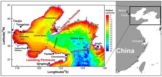 The Bohai Sea is an inner sea, located in Northern China, which suffers from frequent storm surges. It consists of Liaodong Bay, Bohai Bay, Laizhou Bay and the central basin (Figure 1). The Bohai Sea coast is characterized by a gently varying seabed, which together with its semi-enclosed nature, makes it vulnerable to storm surges [15,16,17]. The Bohai Sea is influenced by continental climate and temperate monsoon. Generally, the wind in winter is stronger than that in summer [18,19] and the annually averaged significant wave height (Hs) is ~0.6 m [20]. As a populated zone in the north and the northeast of China, the region around the Bohai Sea is experiencing a fast social and economic development, with several important ports and metropolises located there. Because of the social and economic importance of this area, the disasters caused by the frequent storm surges that result from the Bohai Sea climatic and physical characteristics have attracted the attention of researchers, the public and the government.