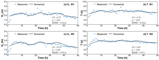 Applying the calibrated parameters, the measured wave periods and significant heights at W1 (with a depth of 5 m) and W2 (with a depth of 7 m) (see Figure 1) near the Huanghua Port in Hebei Province, China, during a storm from 16:00 UTC on 24 November 2003 to 15:00 UTC on 25 November 2003 [27], were used to further validate the wave model. Figure 3 shows the comparison of field-measured and model-simulated significant wave height (Hs) and wave period (T) (output from run 5). The field-measured and model-simulated wave periods and heights are in acceptable agreement in magnitude and variation, with the correlation coefficients (CC) between the model-simulated results and field-data being around or superior to 0.7.