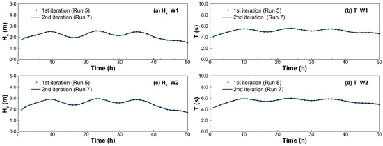 Comparison between the wave parameters output from the 1st iteration (run 5, blue dots) and the 2nd iteration (run 7, black line). (a) Significant wave height (Hs) at W1. (b) Significant wave period (T) at W1. (c) Significant wave height at W2. (d) Significant wave period at W2.