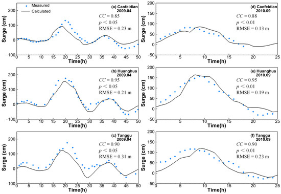 Comparison between model-simulated and field-measured surges for the cases 1–6 presented in Table 2, respectively. Blue dots: measured [28,29]; blackline: calculated with radiation stress (run 4).