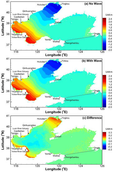 Wave effects on the surge (at the time step for which the surge in the south Bohai Sea peaks). (a) Surge distribution without waves (run 6). (b) Surge distribution with waves (run 4). (c) Difference between surge distributions with and without waves (surge with waves subtracted by that without waves).