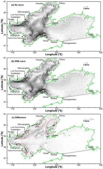 The surge changes in Figure 6 are due to the mass transport caused by waves. In this subsection, the wave-induced currents are calculated by subtracting the currents driven by tide and wind (run 6) from the results that consider tide, wind and waves (run 4). Figure 7a,b show the currents at the time when the surge in the south part of the Bohai Sea peaks (same time as for Figure 6). Evidently, in the offshore region, the general flow patterns of runs 4 and 6 are similar. There is a circulation in the central basin of the Bohai Sea in both runs. This similarity is confirmed by the small differences in currents between runs 4 and 6 shown in Figure 7c.