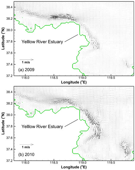 Figure 8 shows the strong longshore currents occurring near the Yellow River estuary at the time when the surges in the south part of the Bohai Sea peaks in 2009 and 2010. The longshore currents in this region are directed towards the south of the Bohai Bay and to the west of the Laizhou Bay. Following the currents, the water is transported from the Yellow River estuary to the south of the Bohai Bay and to the west of the Laizhou Bay, and is accumulated in the shallow water regions of the two bays, resulting in a rise in the water levels. This phenomenon corresponds to the higher surges near the Yellow River estuary, the south of the Bohai Bay and the south and west of the Laizhou Bay.